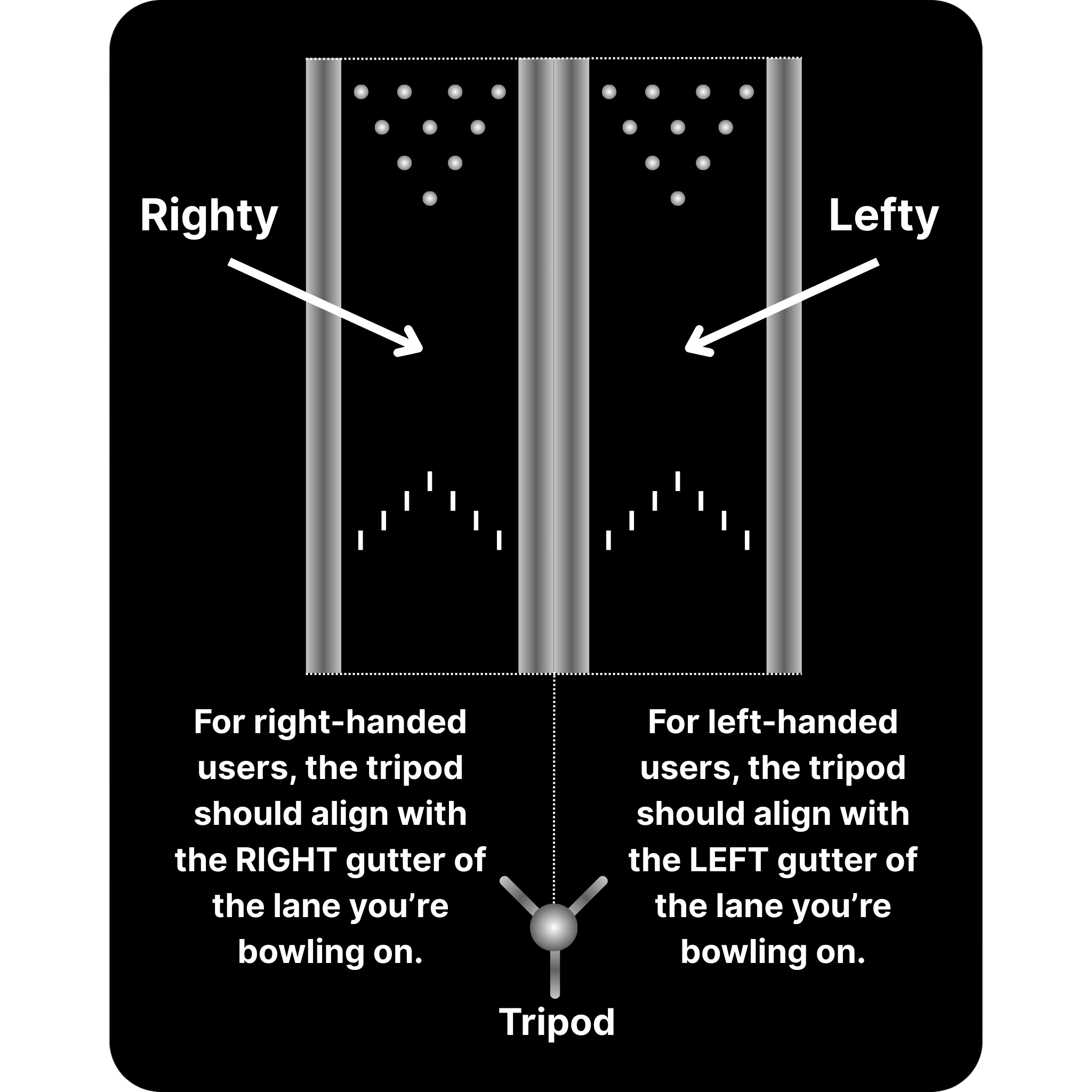 - For setting up the tripod, make sure it is aligned with the right gutter for righties, and the left gutter for lefties. This is to ensure your body does not block the camera from seeing your ball on the lane