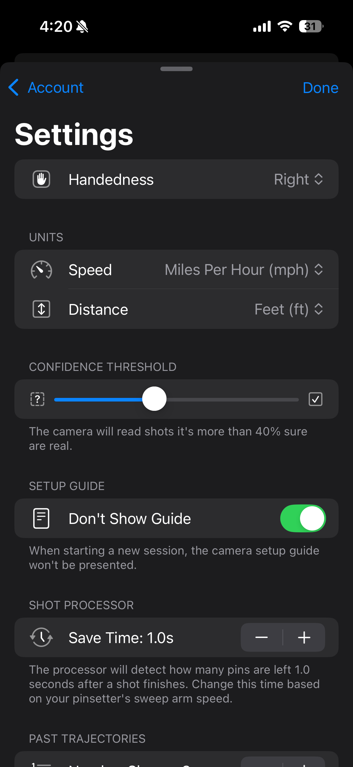 Changing the ‘handedness’ setting to ‘Right’ or ‘Left” will depend on your bowling style and will affect the statistics. If you are a right-handed bowler, you should choose the ‘Right’ setting (the ball hooks to the LEFT), whereas if you are a left-handed bowler (the ball hooks to the RIGHT), you should choose the ‘Left’ setting for accurate measurements.Units