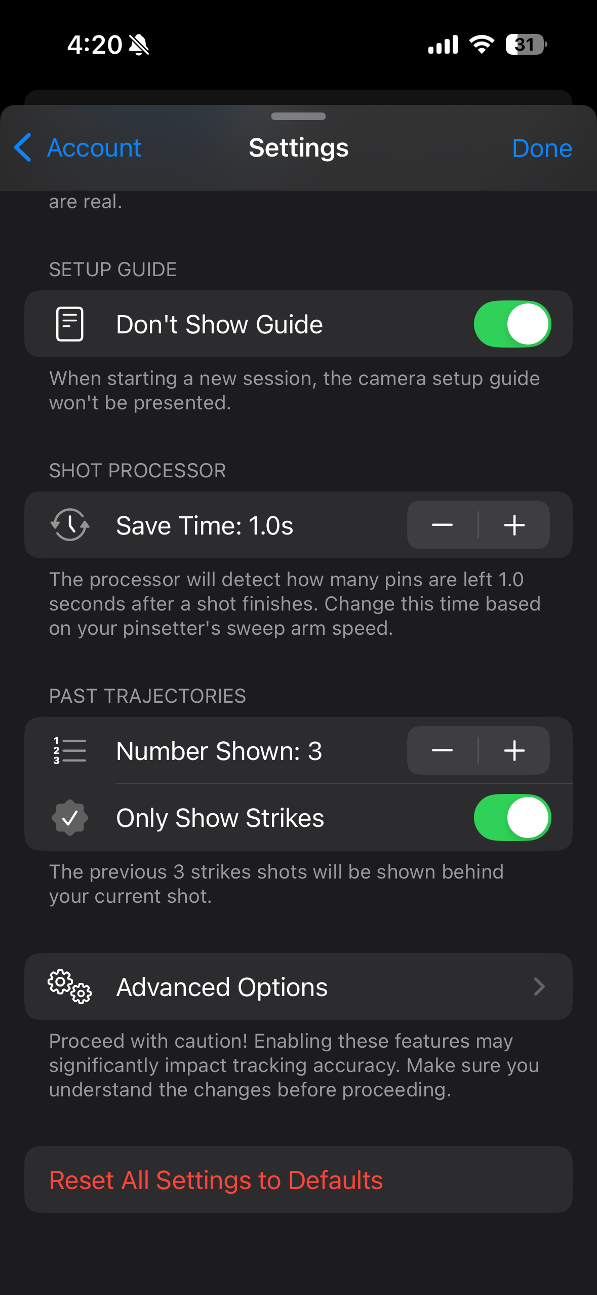 This setting is only for visual purposes; changing this value will only impact the thickness of the lines drawn on the camera feed (e.g. the bounding boxes of the ball and the pins or the outline of the lane)If you’ve altered some settings and do not remember what the defaults were, scroll to the bottom of the settings menu and click “Reset All Settings to Defaults”.